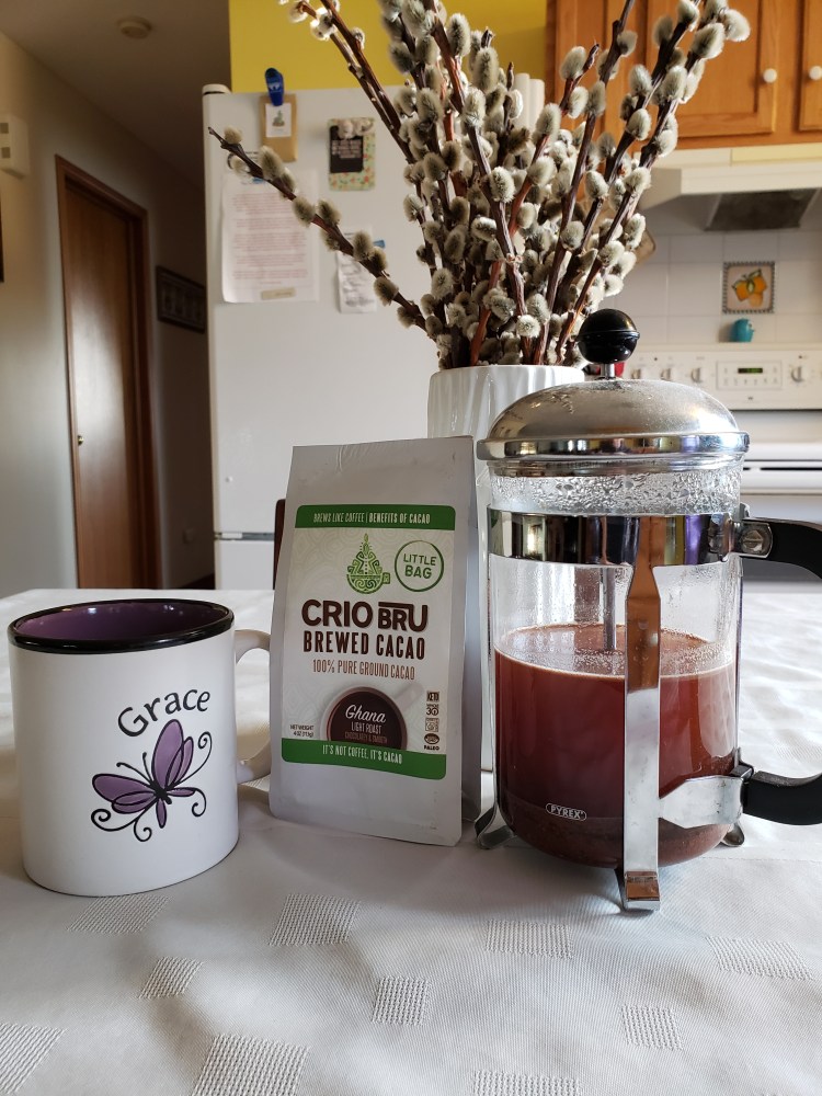 As I puttered in the kitchen, I was feeling a bit edgy so I wanted to stop that negativity in it’s tracks. Then I remembered one of the Mother’s Day gifts my daughter had sent! Cocoa beans that could be brewed like coffee! What could be better than chocolate for breakfast!